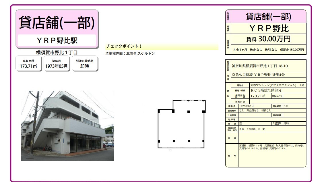 不動産iLandでは、横須賀市野比1-18-10をはじめ、東京・神奈川・千葉・埼玉・横浜・川崎等、首都圏を中心に貸事務所・賃貸オフィス・貸店舗・レンタルオフィス・貸ビル・新築貸事務所の情報満載です。 横須賀市野比1-18-10のショールーム・営業所・リース店舗や物販の貸事務所・賃貸オフィスも簡単検索できます。 横須賀市野比1-18-10でSOHOの貸事務所から100坪以上の貸事務所・賃貸オフィスまで、物件数No1の不動産iLandにお任せ下さい。 その他、横須賀市野比1-18-10に貸事務所・貸店舗・貸ビルを所有のオーナー様には物件登録システムで無料にて貸事務所・貸店舗・賃貸オフィスの広告を掲載致します。 貸事務所・貸店舗の移転手続き、オフィスのレイアウトから内装工事のサポートも万全です。 事務所、店舗の他、貸倉庫、貸工場も不動産iLandにお任せ下さい。 |