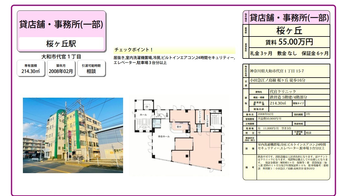 トップページ > 物件検索 > 神奈川県大和市 > 桜ヶ丘の貸事務所・貸店舗 > 大和市代官1-15-7 代官クリニック