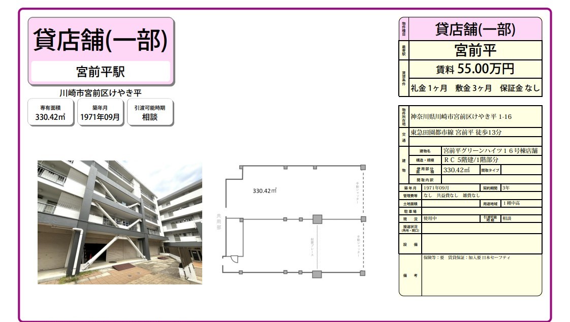 | 物件名 | 宮前平グリーンハイツ16号棟店舗 |