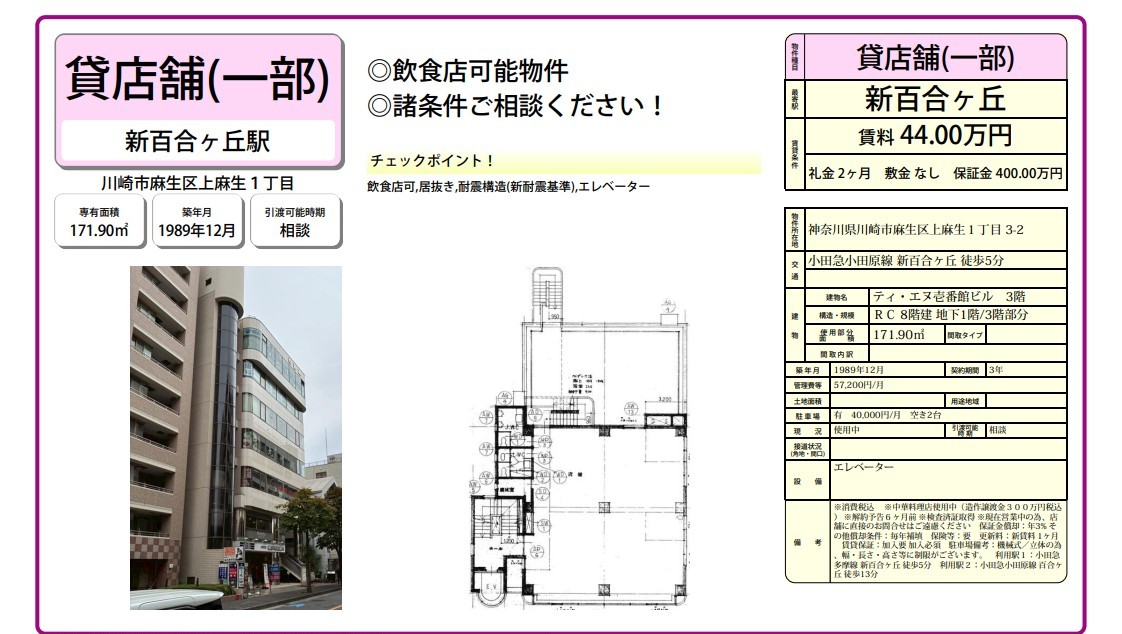 トップページ > 物件検索 > 川崎市麻生区 > 新百合ヶ丘の貸事務所・貸店舗 > 川崎市麻生区上麻生1-3-2 ティ・エヌ壱番館ビル