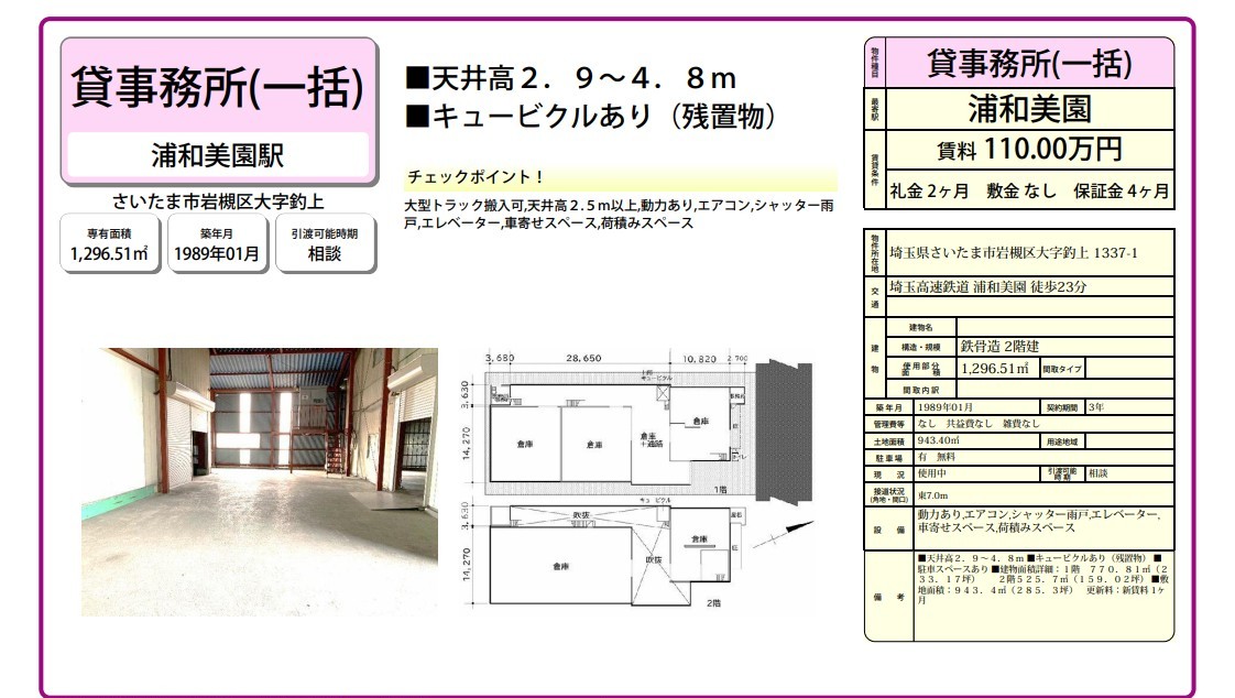 | 備考 | 大型トラック搬入可天井高2.5m以上 条件交渉ご相談ください。 |