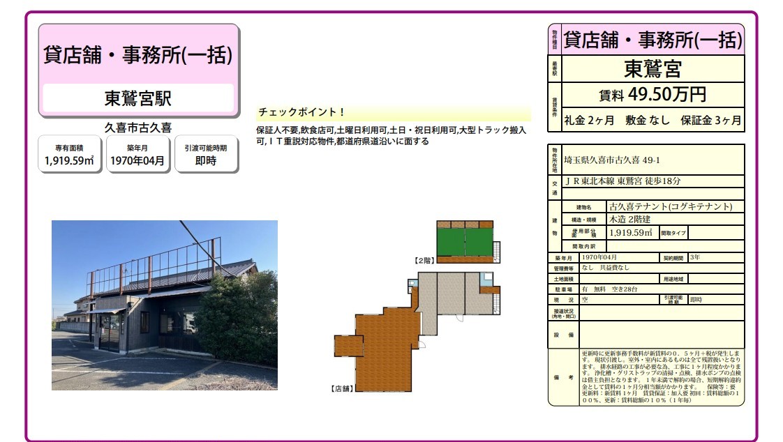 | 備考 | 保証人不要飲食店可土曜日利用可土日・祝日利用可大型トラック搬入可IT重説対応物件都道府県道沿いに面する 条件交渉ご相談ください。 |