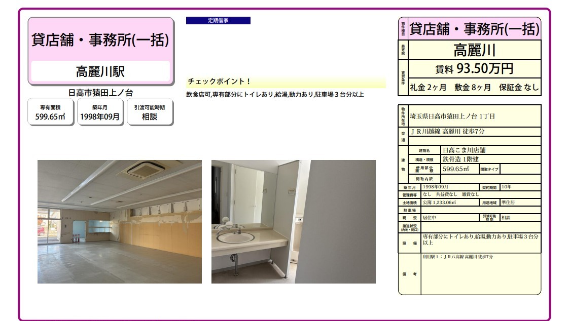 日高市猿田上ノ台1丁目 日高こま川店舗 詳細データ