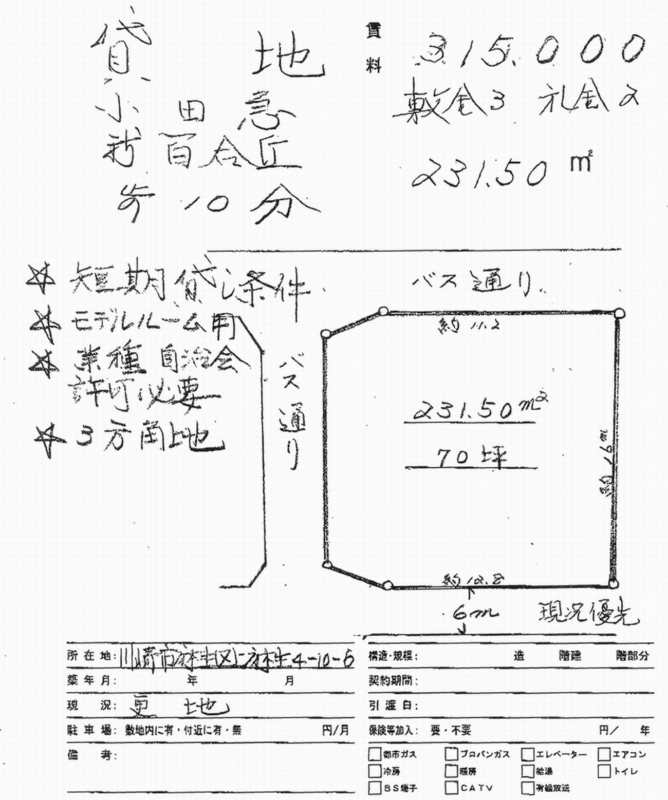 | 備考 | 3方角地 視認性大 大型車可 使用用途・条件交渉ご相談下さい。 |
