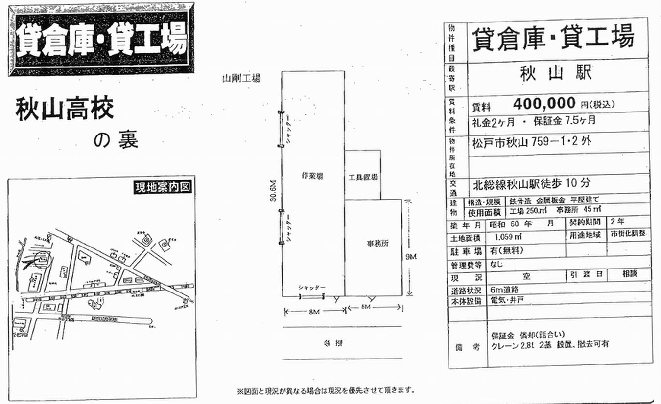 松戸市秋山759-1をはじめ東京・神奈川・千葉・埼玉・横浜・川崎の貸倉庫・貸工場・賃貸土地の情報を検索できます。松戸市秋山759-1の事務所付・ホイスト・クレーン付、キュービクル、工業地域の貸し倉庫・貸し工場もプロがお探しします。松戸市秋山759-1の貸倉庫・貸工場・賃貸土地は物件数No1の不動産iLANDにお任せ下さい。松戸市秋山759-1で貸倉庫・貸工場・賃貸土地を所有のオーナー様には貸し倉庫・貸し工場の広告を掲載致しますので是非、ご相談下さい。貸倉庫・貸工場・賃貸土地を貸したい方も、借りたい方も不動産iLAND! |