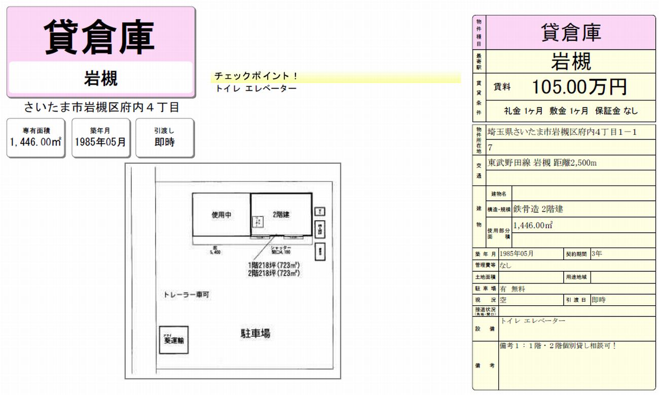| 備考 | トレーラー可 エレベーター トイレ シャッター 事務所 |