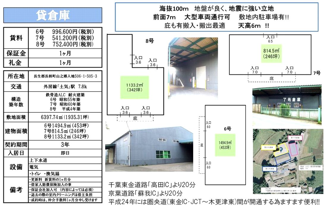 | 備考 | 天井高5M以上 大型車両可 海抜100m 地盤が良く、地震に強い好立地 千葉東金道「高田IC」・京葉道路「蘇我IC」約20分 平成24年には圏央道開通により更にアクセスが便利になります |