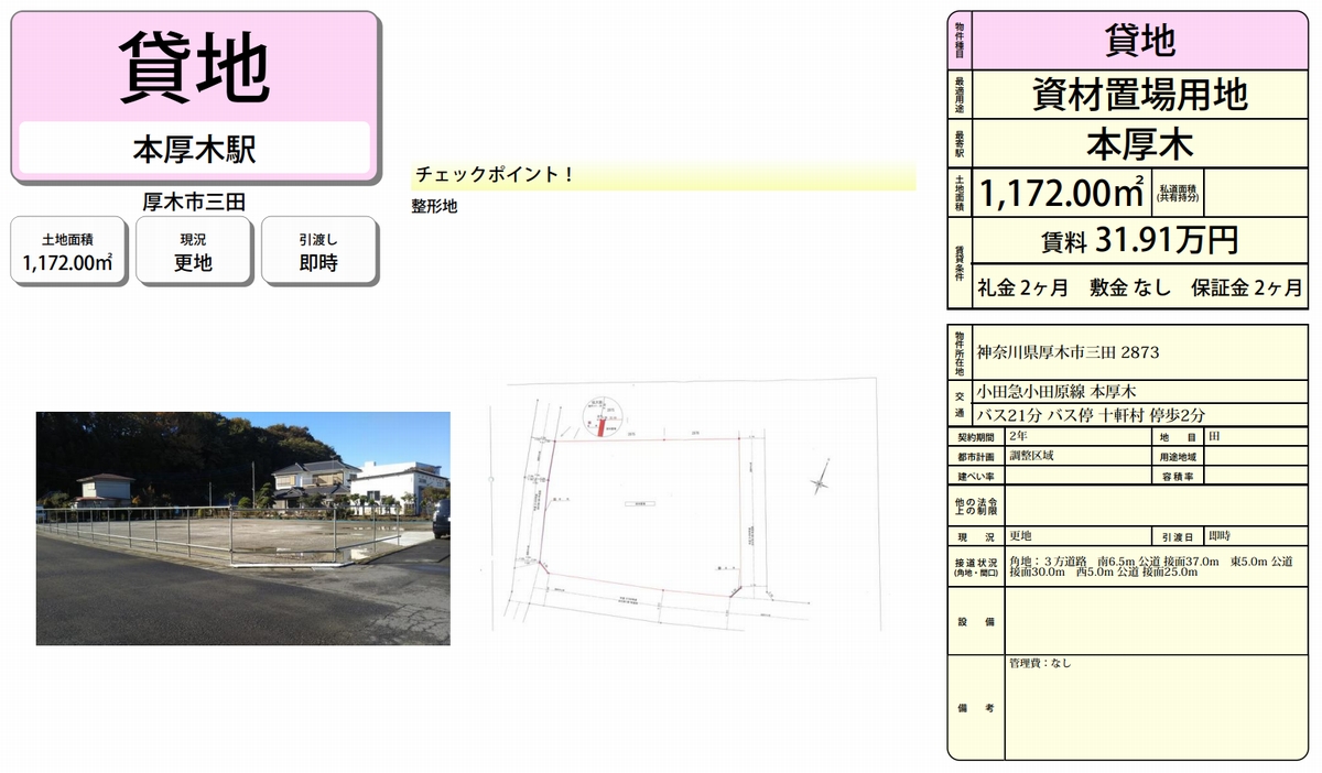 厚木市三田2873をはじめ東京・神奈川・千葉・埼玉・横浜・川崎の貸倉庫・貸工場・賃貸土地の情報を検索できます。厚木市三田2873の事務所付・ホイスト・クレーン付、キュービクル、工業地域の貸し倉庫・貸し工場もプロがお探しします。厚木市三田2873の貸倉庫・貸工場・賃貸土地は物件数No1の不動産iLANDにお任せ下さい。厚木市三田2873で貸倉庫・貸工場・賃貸土地を所有のオーナー様には貸し倉庫・貸し工場の広告を掲載致しますので是非、ご相談下さい。貸倉庫・貸工場・賃貸土地を貸したい方も、借りたい方も不動産iLAND! |