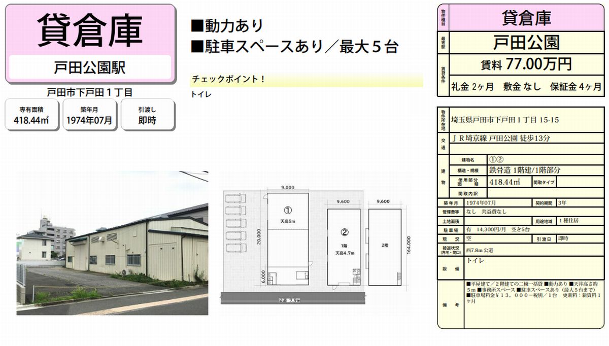 戸田市下戸田1-15-15 戸田公園 貸倉庫 2棟一括貸 詳細データ