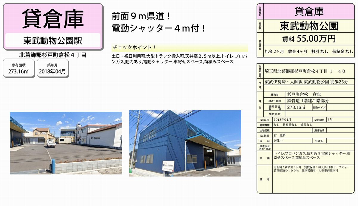 北葛飾郡杉戸町倉松4-1-40 東武動物公園 貸倉庫 詳細データ