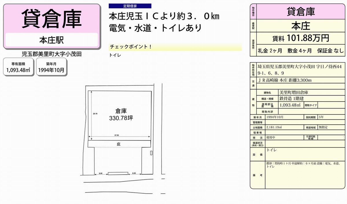 児玉郡美里町小茂田449-1 増田倉庫 詳細データ
