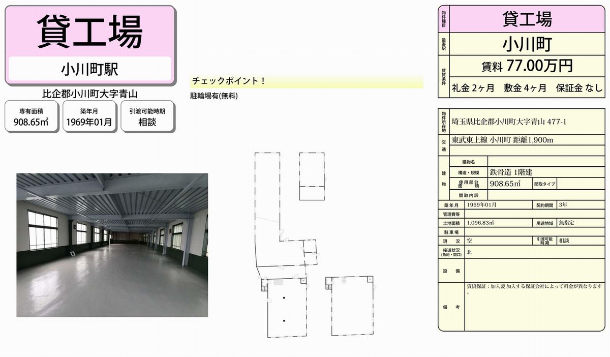 比企郡小川町大字青山477-1 小川町 貸工場 詳細データ