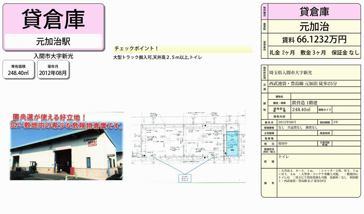 | 備考 | シャッター 大型車進入可 トイレ 希少危険物倉庫 |