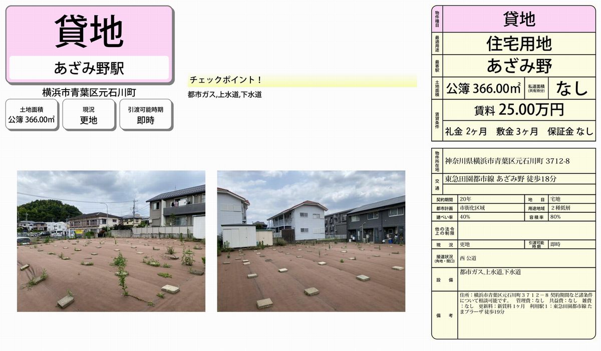 横浜市青葉区元石川町3712-8 あざみ野 貸地 詳細データ