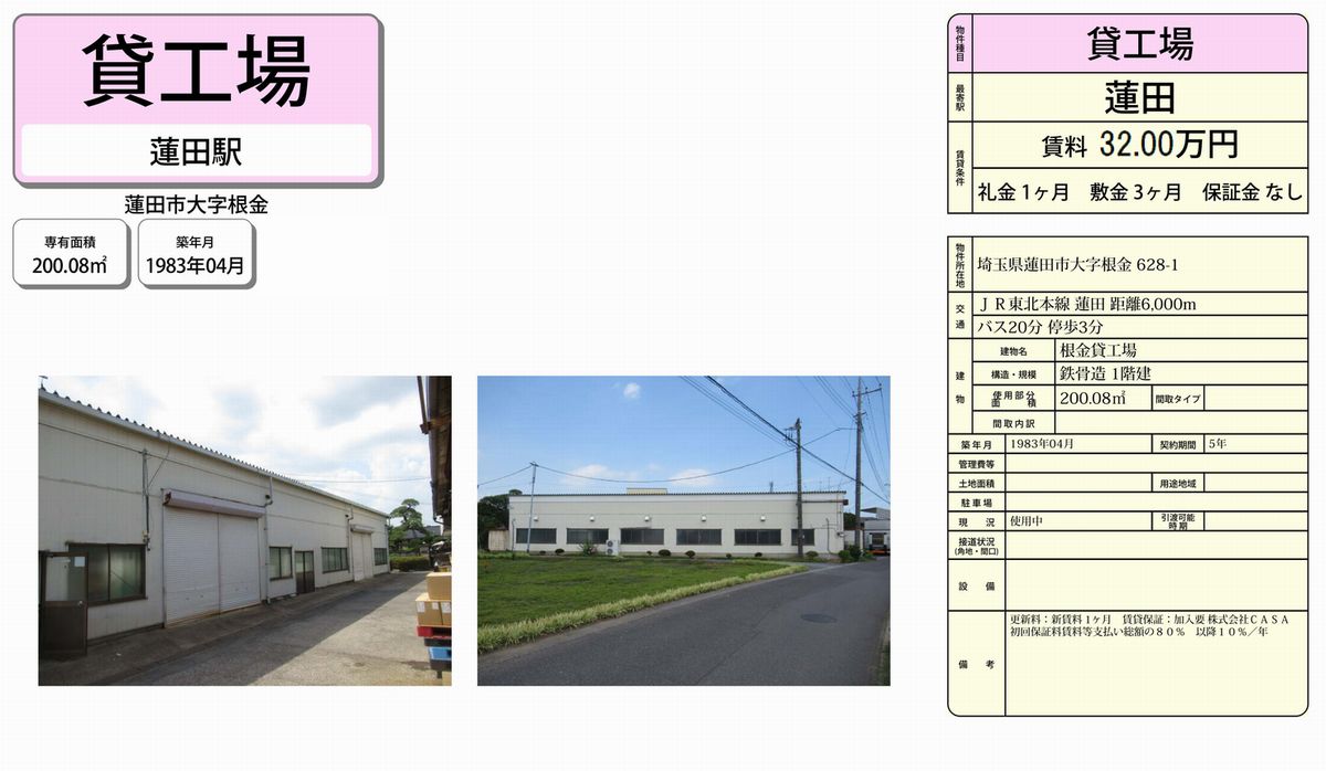 蓮田市根金628-1をはじめ東京・神奈川・千葉・埼玉・横浜・川崎の貸倉庫・貸工場・賃貸土地の情報を検索できます。蓮田市根金628-1の事務所付・ホイスト・クレーン付、キュービクル、工業地域の貸し倉庫・貸し工場もプロがお探しします。蓮田市根金628-1の貸倉庫・貸工場・賃貸土地は物件数No1の不動産iLANDにお任せ下さい。蓮田市根金628-1で貸倉庫・貸工場・賃貸土地を所有のオーナー様には貸し倉庫・貸し工場の広告を掲載致しますので是非、ご相談下さい。貸倉庫・貸工場・賃貸土地を貸したい方も、借りたい方も不動産iLAND! |