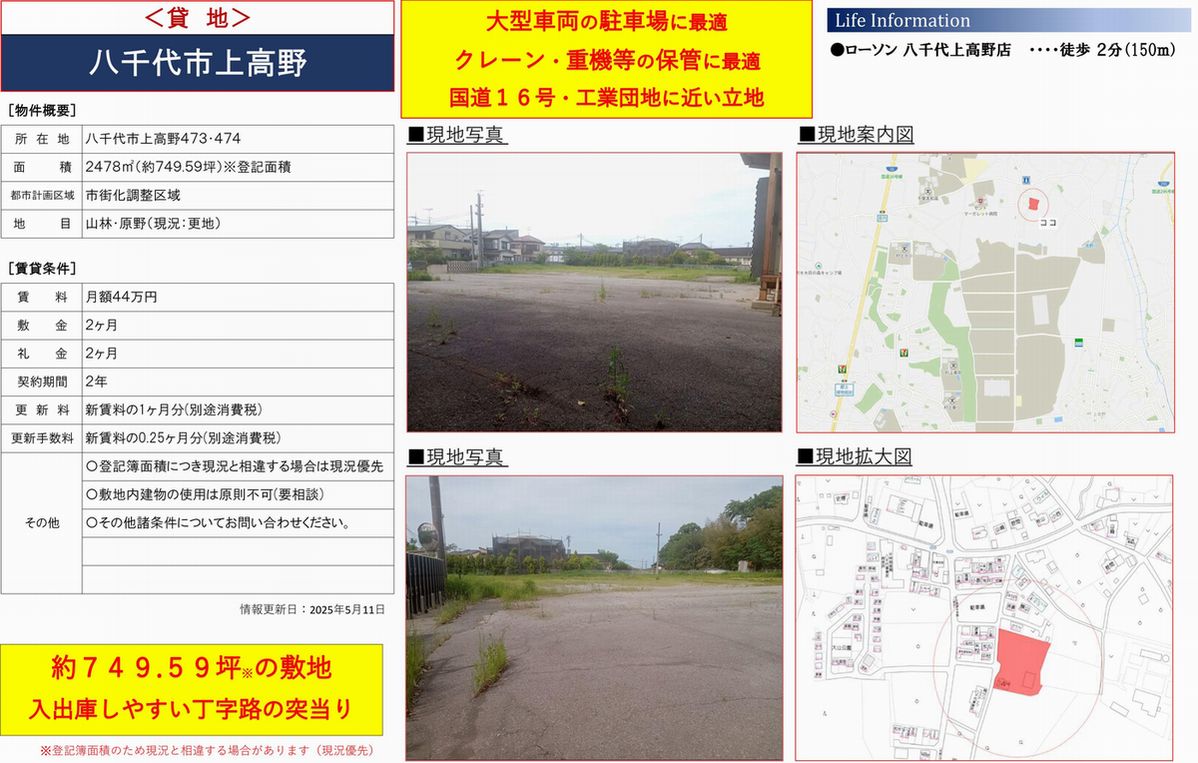 | 備考 | クレーン・重機の保管 大型車両駐車場 |