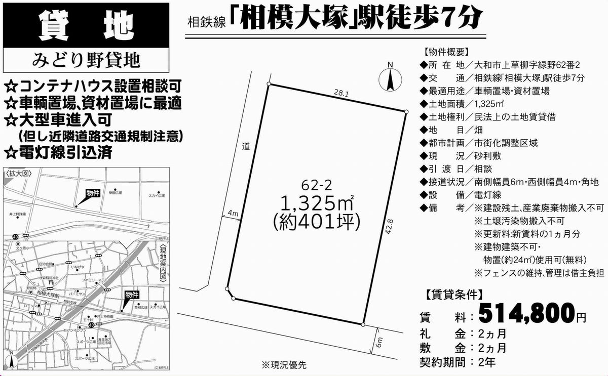 | 備考 | 車両置き場・資材置き場 コンテナハウス相談可 |
