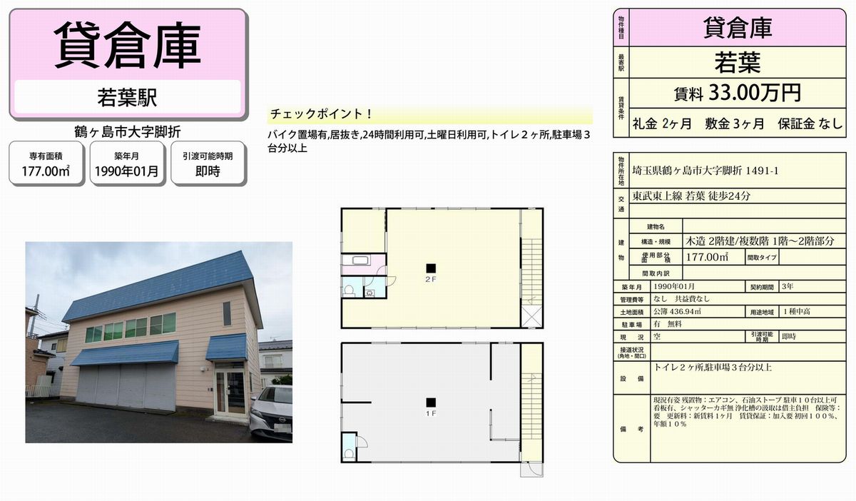 鶴ヶ島市脚折1491-1 若葉 貸倉庫 詳細データ