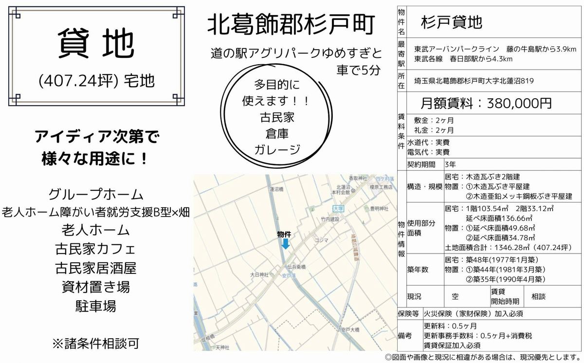 備考 | ガレージ・古民家・倉庫・資材置き場・駐車場 建物有 |