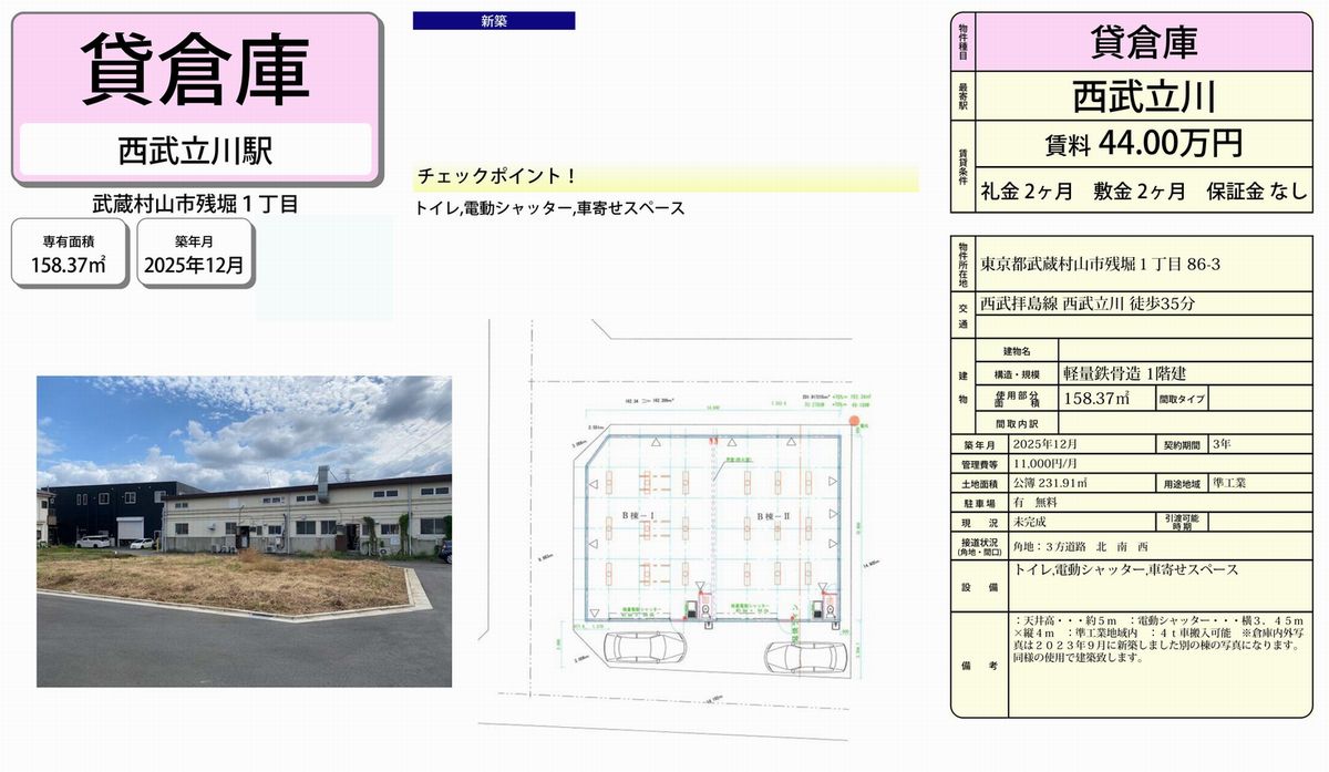 武蔵村山市残堀1-86-3 西武立川 貸倉庫B 詳細データ