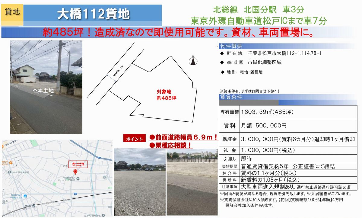 松戸市大橋112-1をはじめ東京・神奈川・千葉・埼玉・横浜・川崎の貸倉庫・貸工場・賃貸土地の情報を検索できます。松戸市大橋112-1の事務所付・ホイスト・クレーン付、キュービクル、工業地域の貸し倉庫・貸し工場もプロがお探しします。松戸市大橋112-1の貸倉庫・貸工場・賃貸土地は物件数No1の不動産iLANDにお任せ下さい。松戸市大橋112-1で貸倉庫・貸工場・賃貸土地を所有のオーナー様には貸し倉庫・貸し工場の広告を掲載致しますので是非、ご相談下さい。貸倉庫・貸工場・賃貸土地を貸したい方も、借りたい方も不動産iLAND! |
