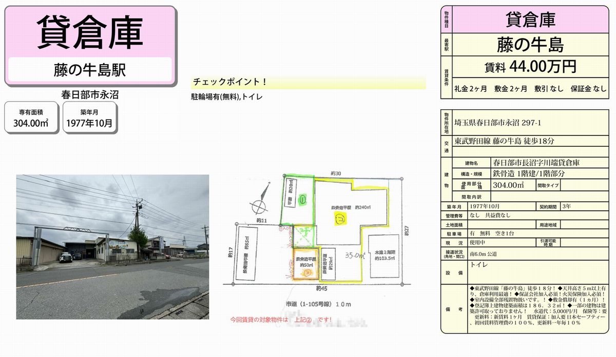 春日部市永沼297-1 藤の牛島 貸倉庫2 詳細データ