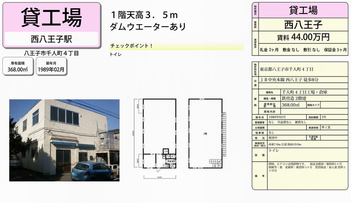 八王子市千人町4-10-2 西八王子駅 貸工場 一棟貸 詳細データ