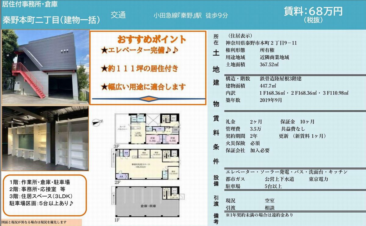 | 備考 | EV トイレ キッチン ソーラー発電 3F住居付き 1F駐車場5台付 |