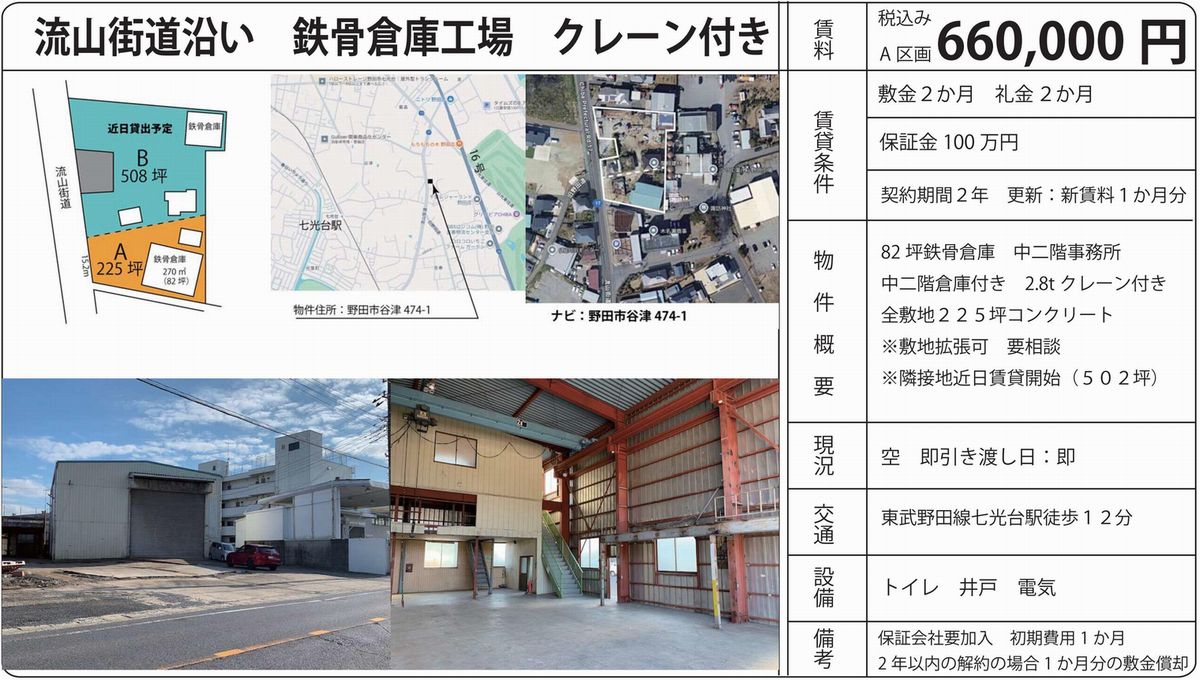 野田市谷津474-1 七光台 貸倉庫 詳細データ