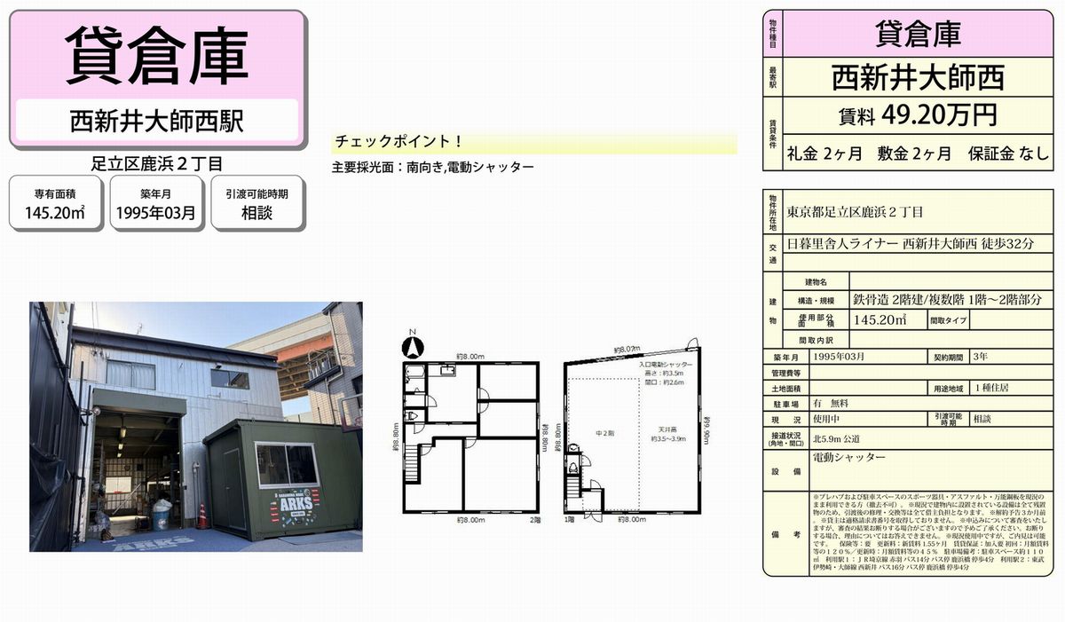 足立区鹿浜2-7-17 西新井大師西 貸倉庫 詳細データ
