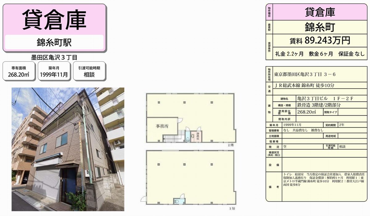 墨田区亀沢3-3-6 錦糸町 貸倉庫 詳細データ