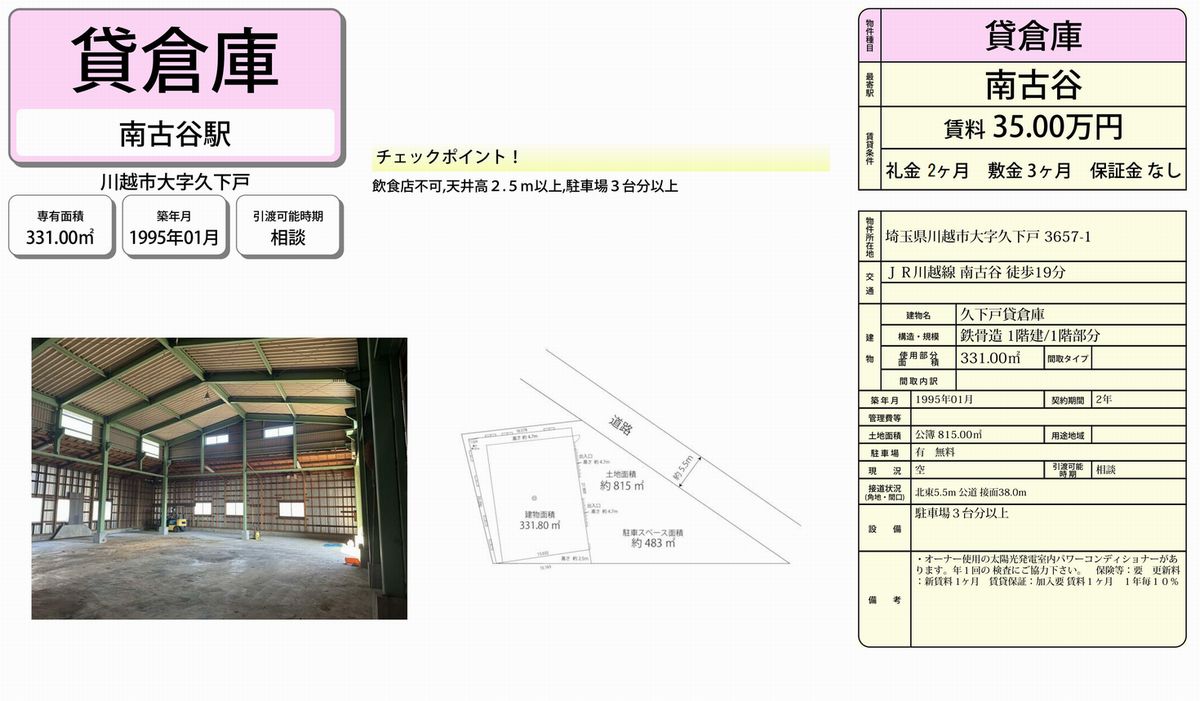 川越市久下戸3657-1 南古谷 貸倉庫 詳細データ