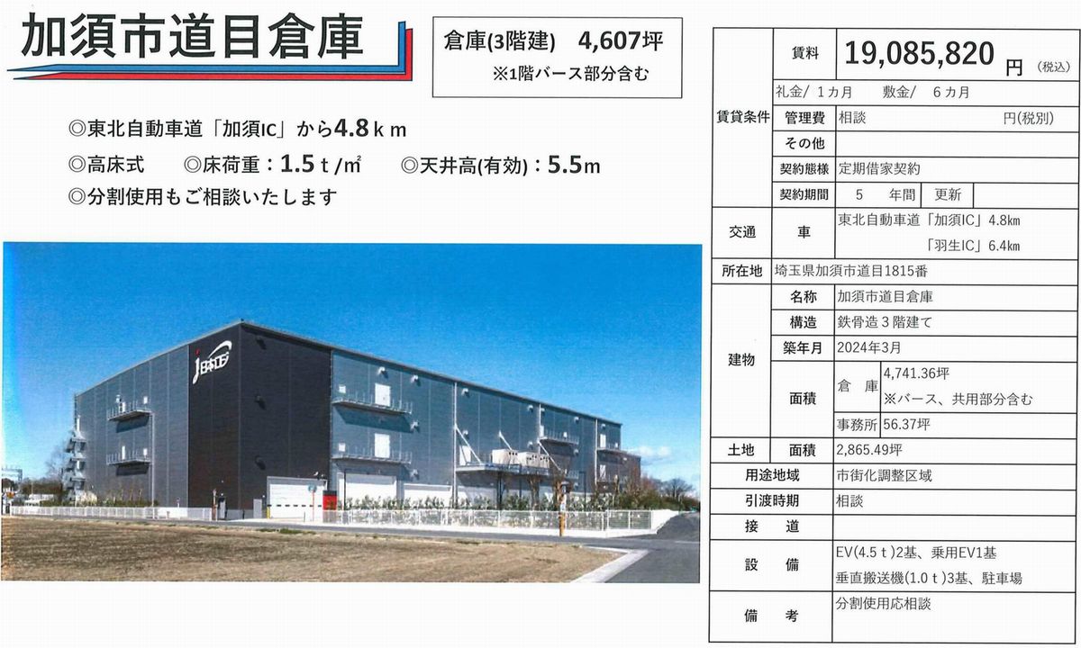 加須市道目1815をはじめ東京・神奈川・千葉・埼玉・横浜・川崎の貸倉庫・貸工場・賃貸土地の情報を検索できます。加須市道目1815の事務所付・ホイスト・クレーン付、キュービクル、工業地域の貸し倉庫・貸し工場もプロがお探しします。加須市道目1815の貸倉庫・貸工場・賃貸土地は物件数No1の不動産iLANDにお任せ下さい。加須市道目1815で貸倉庫・貸工場・賃貸土地を所有のオーナー様には貸し倉庫・貸し工場の広告を掲載致しますので是非、ご相談下さい。貸倉庫・貸工場・賃貸土地を貸したい方も、借りたい方も不動産iLAND! |