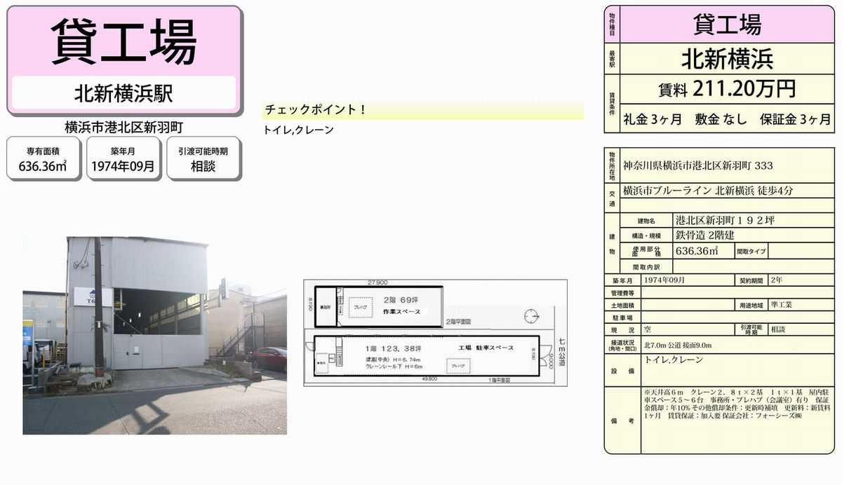 横浜市港北区新羽町333 北新横浜 貸工場 詳細データ