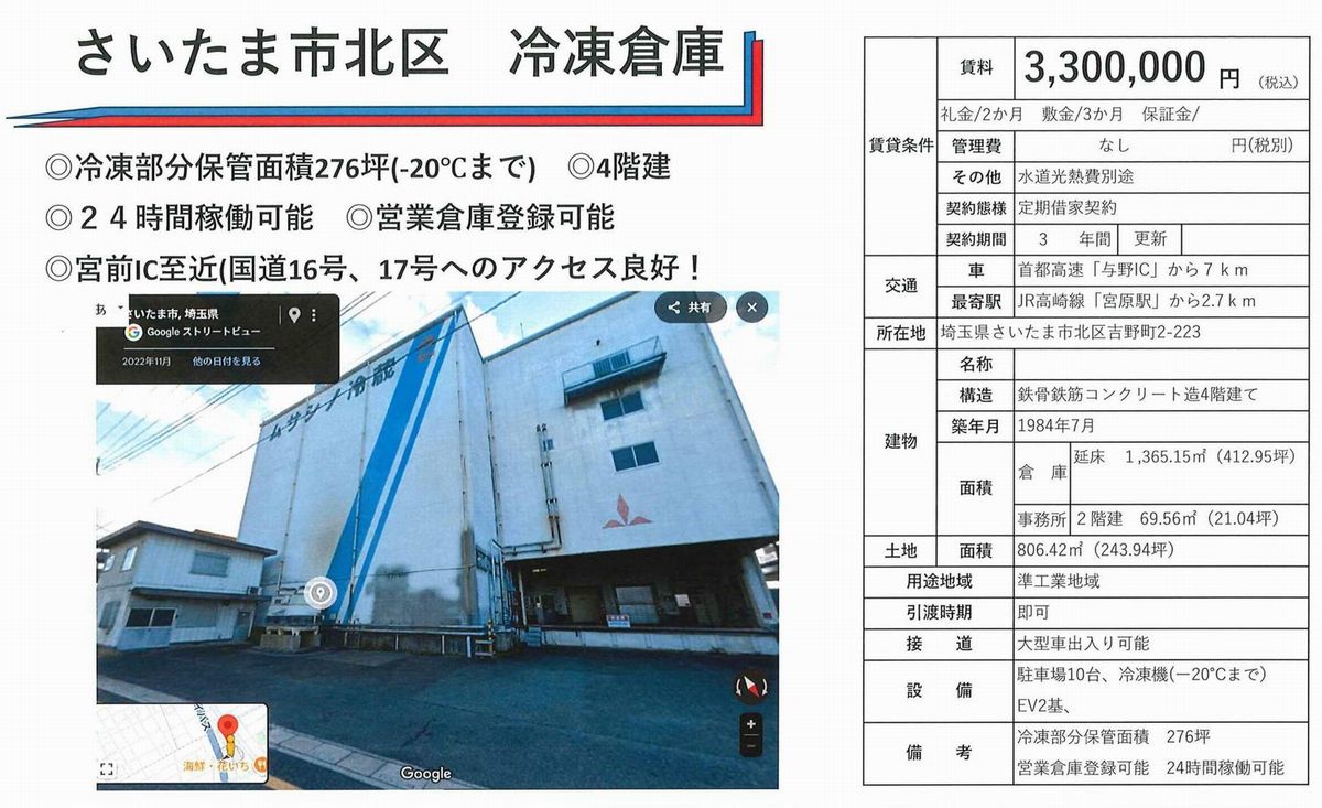 さいたま市北区吉野町2-223をはじめ東京・神奈川・千葉・埼玉・横浜・川崎の貸倉庫・貸工場・賃貸土地の情報を検索できます。さいたま市北区吉野町2-223の事務所付・ホイスト・クレーン付、キュービクル、工業地域の貸し倉庫・貸し工場もプロがお探しします。さいたま市北区吉野町2-223の貸倉庫・貸工場・賃貸土地は物件数No1の不動産iLANDにお任せ下さい。さいたま市北区吉野町2-223で貸倉庫・貸工場・賃貸土地を所有のオーナー様には貸し倉庫・貸し工場の広告を掲載致しますので是非、ご相談下さい。貸倉庫・貸工場・賃貸土地を貸したい方も、借りたい方も不動産iLAND! |