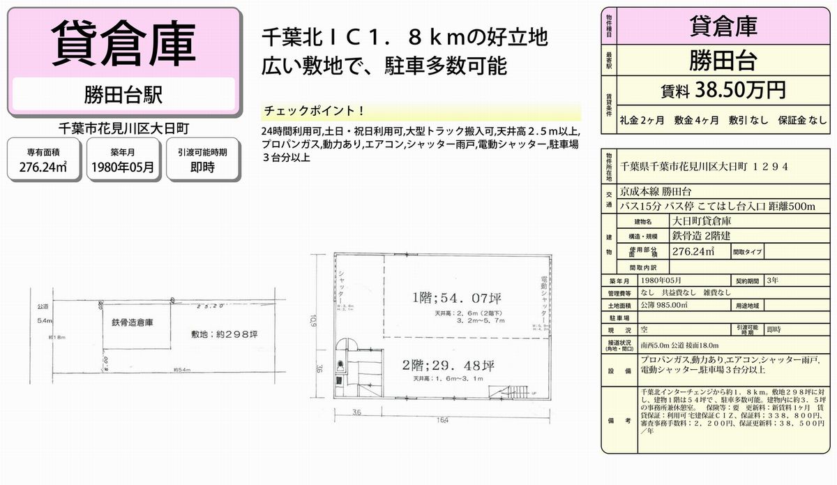 千葉市花見川区大日町1294 勝田台 貸倉庫 詳細データ