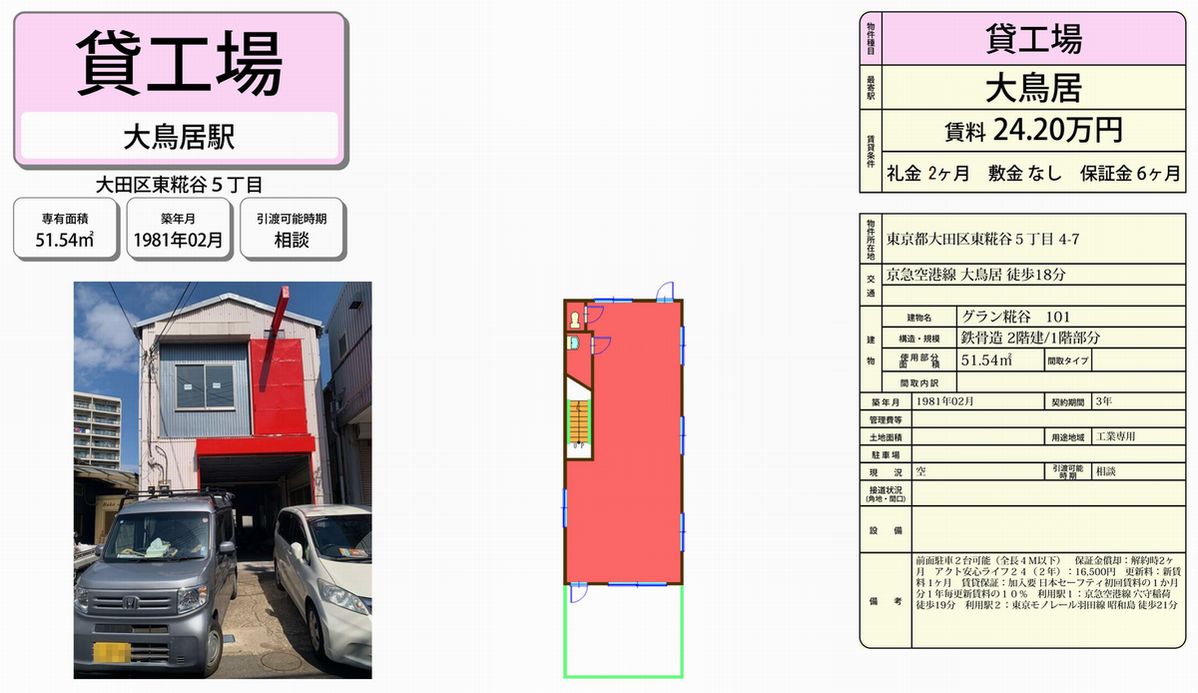 大田区東糀谷5-4-7をはじめ東京・神奈川・千葉・埼玉・横浜・川崎の貸倉庫・貸工場・賃貸土地の情報を検索できます。大田区東糀谷5-4-7の事務所付・ホイスト・クレーン付、キュービクル、工業地域の貸し倉庫・貸し工場もプロがお探しします。大田区東糀谷5-4-7の貸倉庫・貸工場・賃貸土地は物件数No1の不動産iLANDにお任せ下さい。大田区東糀谷5-4-7で貸倉庫・貸工場・賃貸土地を所有のオーナー様には貸し倉庫・貸し工場の広告を掲載致しますので是非、ご相談下さい。貸倉庫・貸工場・賃貸土地を貸したい方も、借りたい方も不動産iLAND! |