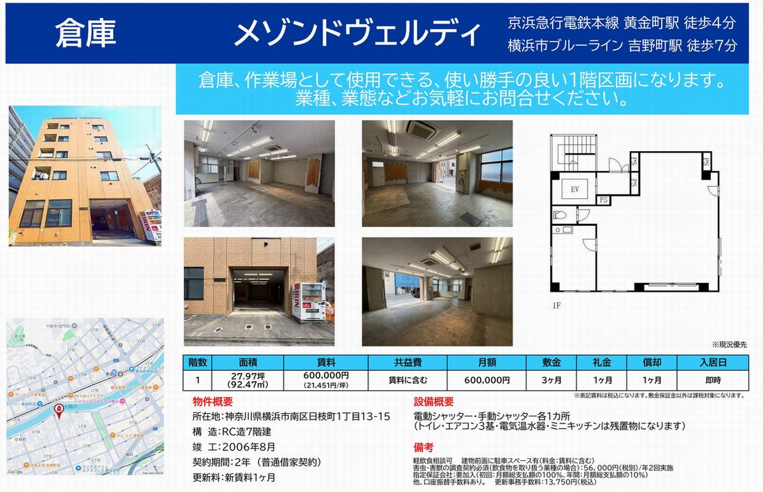 | 備考 | シャッター トイレ・エアコン・ミニキッチン(残置) 前面駐車スペース |