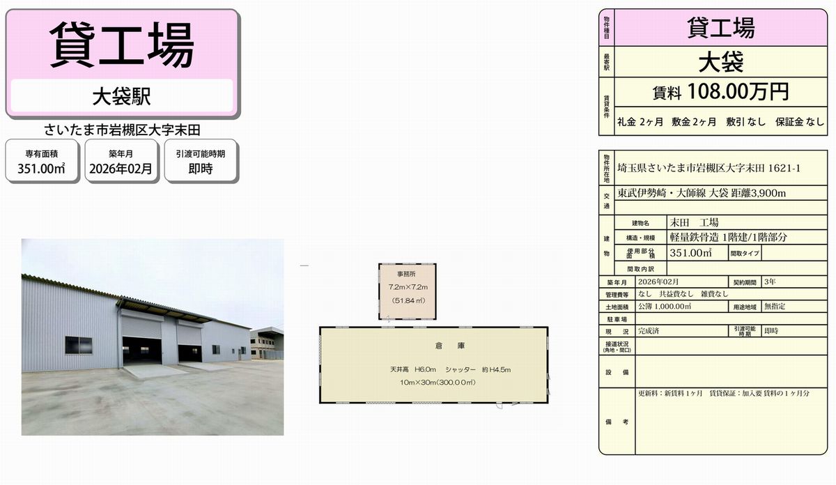さいたま市岩槻区末田1621-1 大袋 貸工場 詳細データ