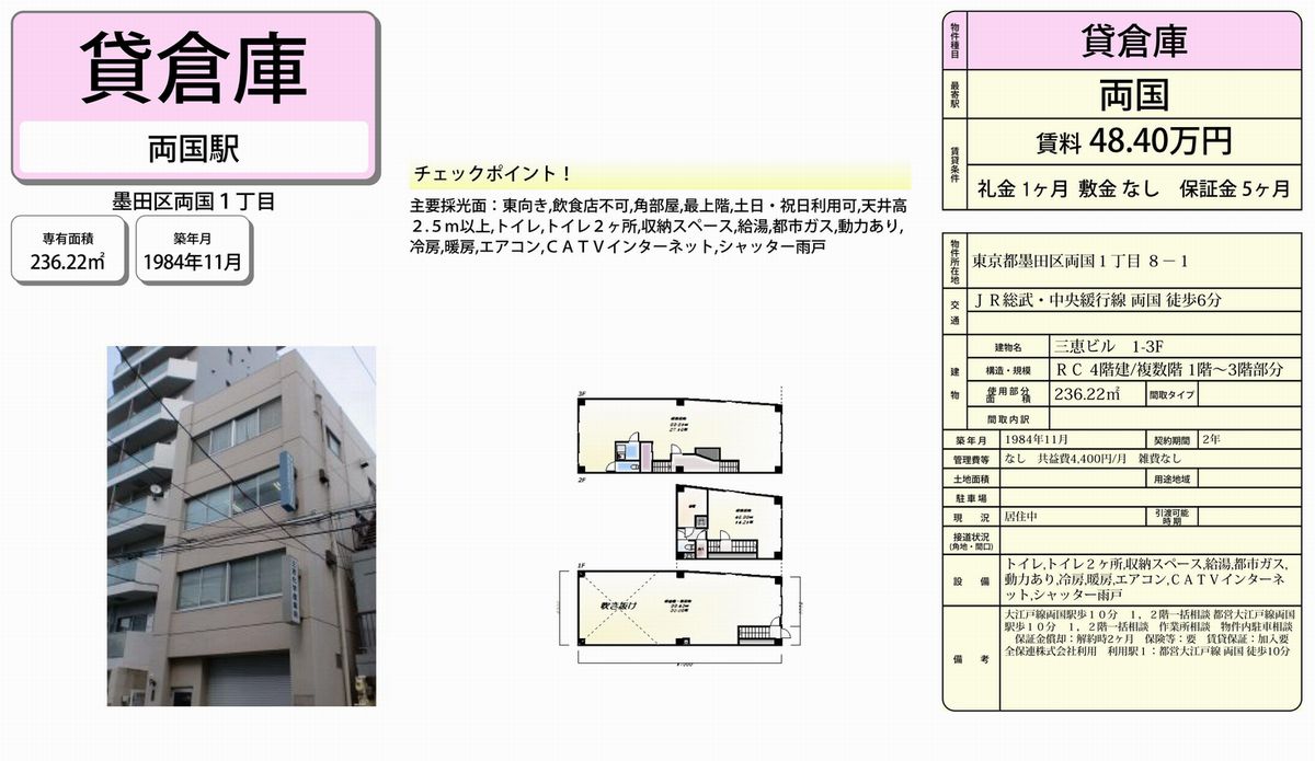 墨田区両国1-8-1 三恵ビル 1-3F部分 詳細データ